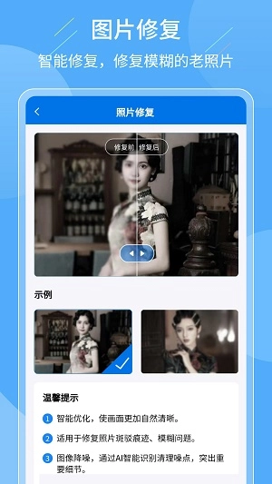 3、借助简单易行的操作步骤,用户能够轻松地把旧照片修复成崭新的模样,让照片的色彩、纹理质感乃至人物的面部特征等都得到还原。