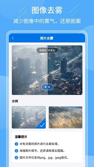 2、软件具备智能去噪功能,能够消除照片中的噪点与雾霾,让图像恢复清晰。