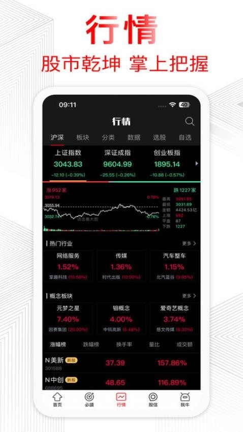 用户可在行情主页中对股市的行情数据进行详情查看,了解行情交易涨跌情况。