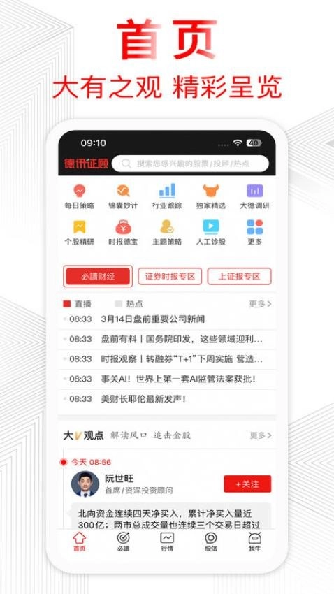 德讯证顾是一款帮助投资者做好投资决策的软件,软件中将证券投资市场的行情数据实时更新展示,让用户轻松掌握市场的最新行情数据,了解股市的涨跌情况观望市场动态趋势,让用户能够从中发现投资时机,将财经必读资讯在线推荐,让用户即时掌握更多最新最热的财经资讯,发掘证券市场的前沿动态信息洞察良机,帮助用户做出最佳的投资策略高效投资,还可以通过人工诊股的方式诊断出股票的投资风险,帮助用户优选好股来投资交易,将专业的投资顾问一键关注,随时关注对方最新发表的投研观点信息轻松掌握专业的风口分析,有需要的用户就快来德讯证顾软件进行使用吧!