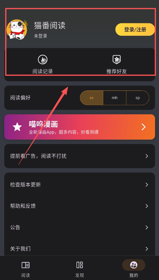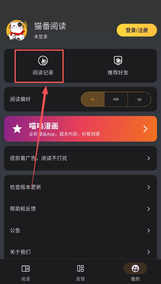 1、咱们先打开猫番阅读,记得去“阅读”那儿登录一下账号嘛,这样它以后就知道该给你推荐啥了。