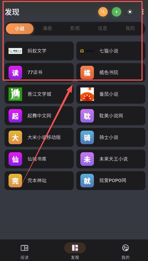 2、找书的话就切换到“发现”页,上面一排都是各种小说网站,像蚂蚁文学、番茄小说啥的,特别省事。