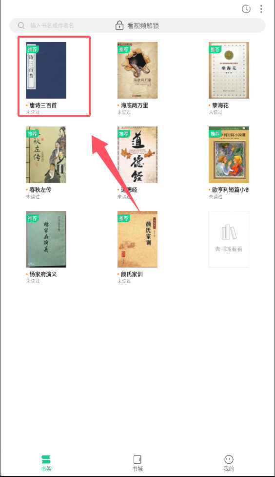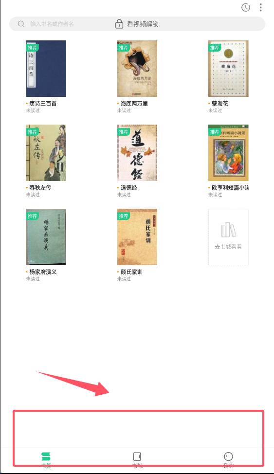 1、打开软件先别急着找书,注意底部导航栏的功能划分:书架存放个人书库,书城提供海量资源,我的进行个性设置。