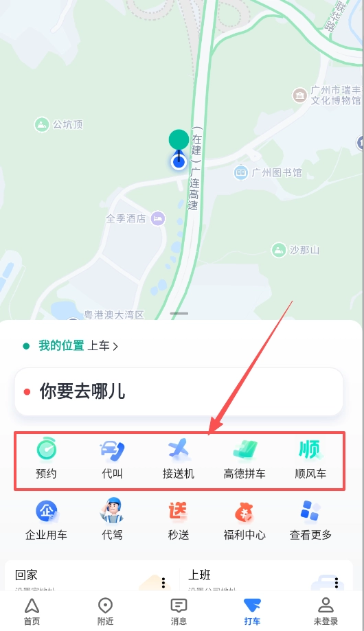 3、当需要打车时,输入目的地后,系统会同步呈现实时打车、拼车、顺风车等多种出行选择,你可以对比不同选项的价格与接驾时间。