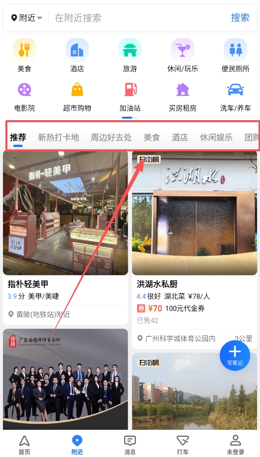 想找附近的吃喝玩乐,只需点击下方的“附近”页签,美食、酒店、加油站等各类服务都已分门别类整理好,直接点击对应分类就能查看详细列表和距离信息,十分便捷省心。