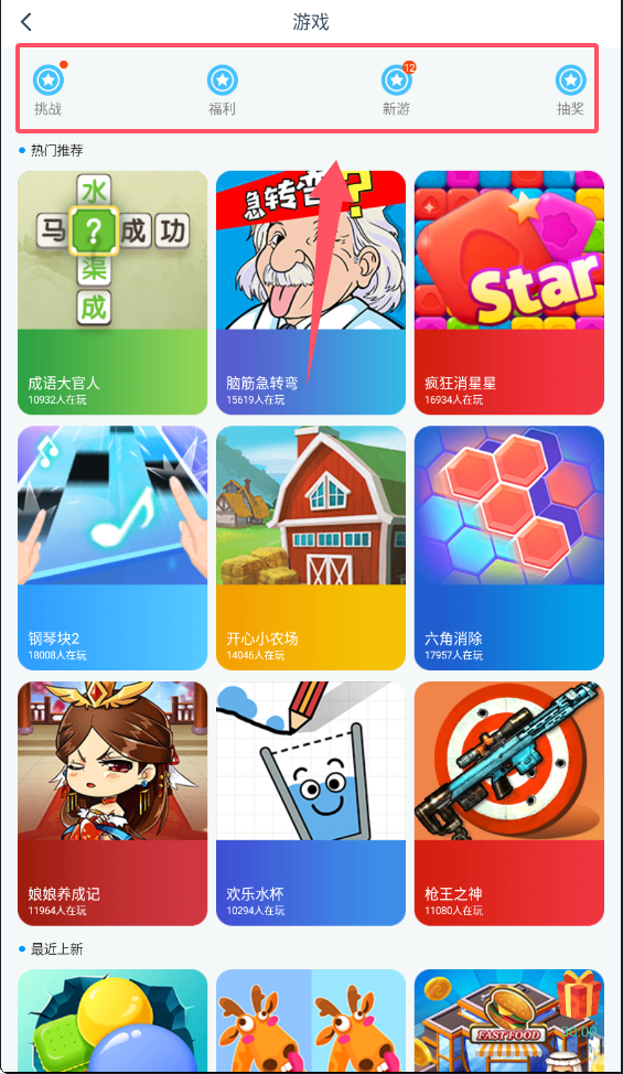 游戏页面设有挑战、福利、新游、抽奖等板块,为玩家带来互动娱乐体验。热门推荐区域会展示游戏的实时在线人数,玩家可据此参考热度来挑选游戏。