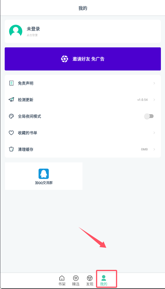 4、在我的页面可以登录账号同步数据,还能设置全局夜间模式、清理缓存等。遇到问题可以加QQ交流群寻求帮助。