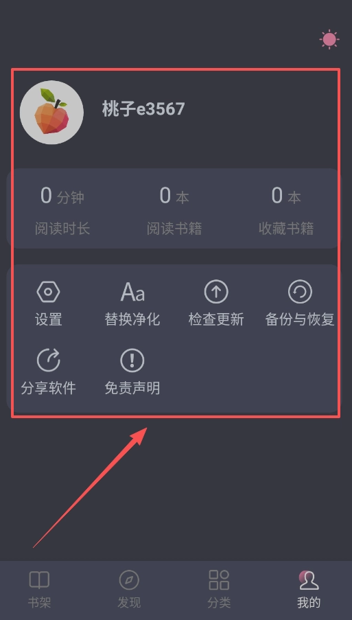 3、进入“我的”页面后,建议优先完成字体大小和备份选项的设置,阅读体验的优化与数据安全的保障,从初始阶段就该重视起来。