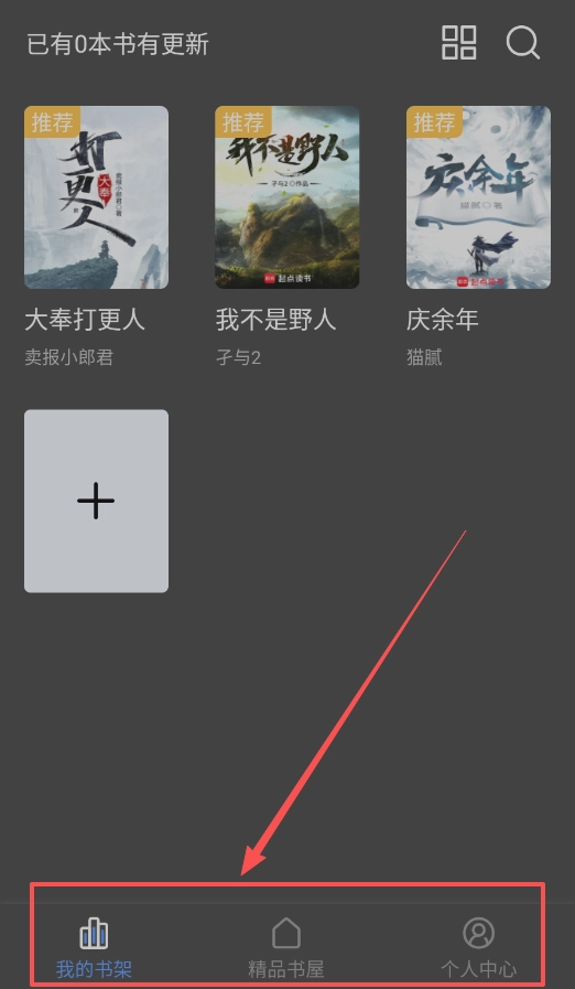3、我的书架是你的阅读中枢,所有收藏和更新信息都集中在这里。推荐栏目会依据大众偏好,呈现《大奉打更人》《庆余年》这类经典作品。