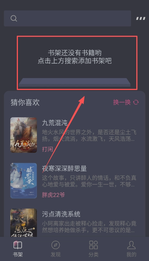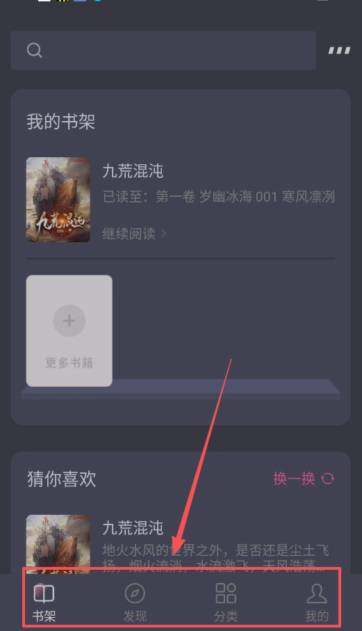 1、首先,在主界面底部的导航栏里,能看到书架、发现、分类和我的这四个核心板块,你可以从中寻找并添加自己喜欢的书籍到书架,这样下次阅读时就能直接找到,十分方便。