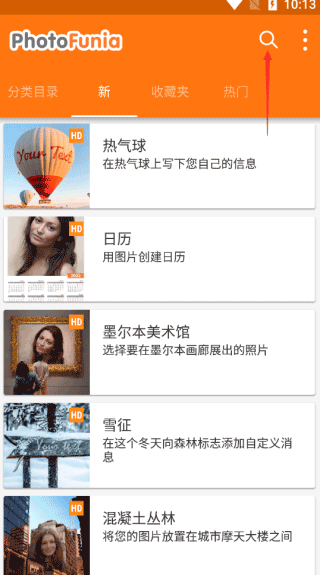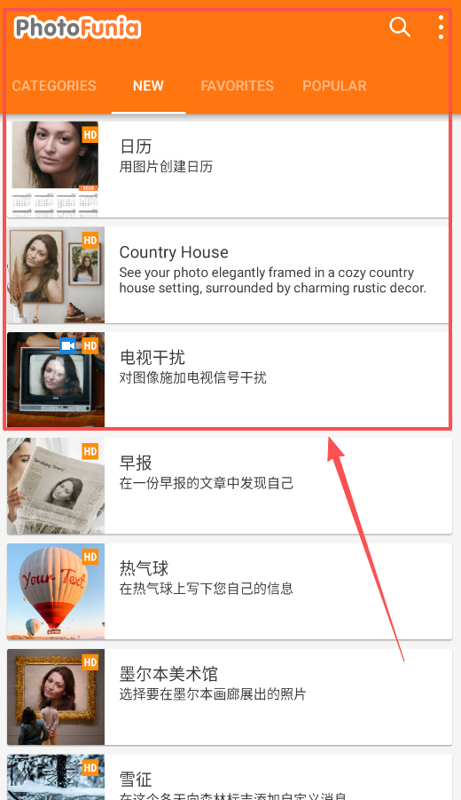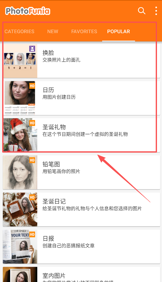 再看Photofunla,它的下方采用清单形式呈现具体功能,像“换脸”“日历”“圣诞日记”等都在其中,而且每个功能都附有简短的说明。