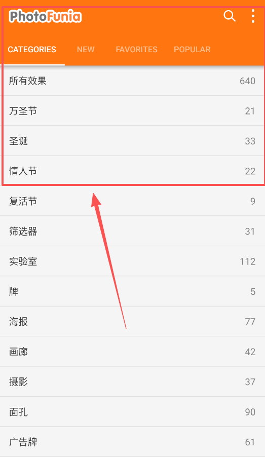 1、PhotoJunio 的主要特色在于清晰的效果分类及数量呈现,用户首先会看到顶部的 NEW、FAVORITES 和 POPULAR 分类栏。