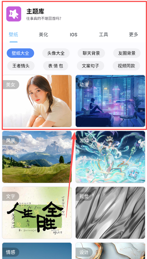 1、打开软件,先看顶部的“壁纸”、“美化”、“IOS”、“工具”几个标签,点进“壁纸大全”或“头像大全”,挑选喜欢的图片。