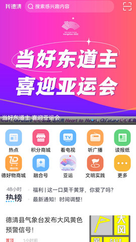 我德清是德清县广播电视台重点打造的多功能线上新闻资讯服务软件,集电视直播、新闻资讯、社交娱乐与生活服务于一体,是具有广播电视特色的移动客户端。作为德清广电新媒体的主流平台,它借助自身为用户提供广播电视节目,以及各类与百姓生活息息相关的实用信息和便民服务。