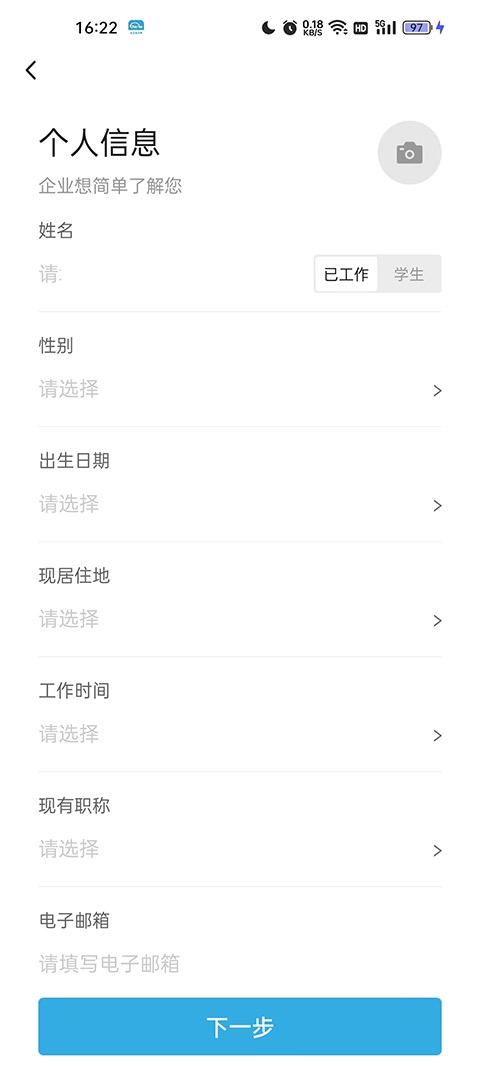 3、选好之后点击“下一步”,接着会进入个人信息页面,需要填写个人信息、现有职称以及电子邮箱,之后再点击“下一步”。