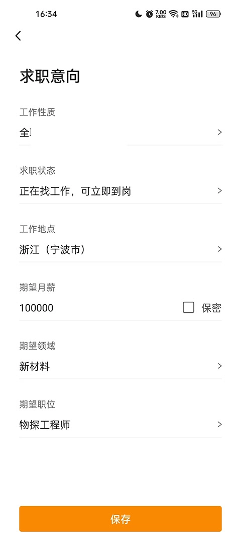 6、最后填写求职意向,把工作性质、工作地点、期望薪资、期望领域、期望职位逐一详细地写清楚;