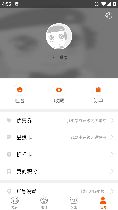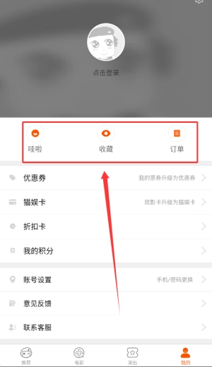 4、该区域还整合了优惠券管理、专属会员卡“猫娱卡”的使用、折扣卡查看以及个人积分余额与使用明细的查询功能。