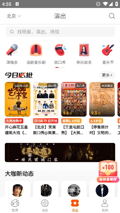 2、该区域对演出类型进行了清晰分类,涵盖大型演唱会、脱口秀表演、音乐节、亲子艺术活动,同时还设有热门演出排行榜单。