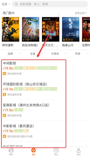 4、电影板块支持依据实时地理位置进行智能筛选,可呈现周边所有合作影院的具体位置、排片场次及票价信息。