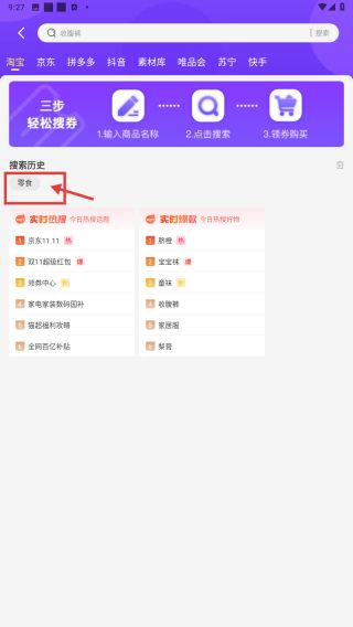 2. 在优惠页面的搜索历史里,点击零食这一选项,查看零食商品列表。