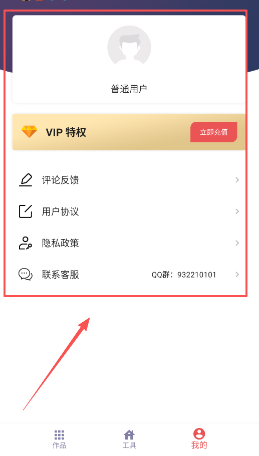 1、首先呢,打开软件后能看到底部导航栏,分别是作品、工具、我的三个板块,我们先点击中间的工具按钮。