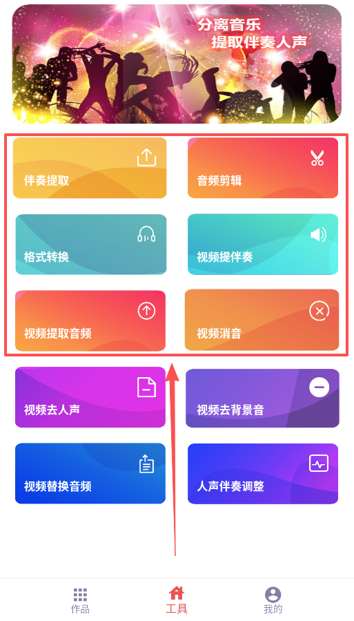 2、接着呢,在工具页面可以看到分离音乐、提取伴奏、音频剪辑等十多种功能,根据需求选择比如伴奏提取或视频去人声。