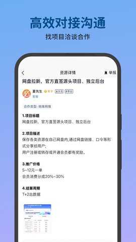 3. 资源对接:平台配备高效的资源对接功能,助力用户迅速锁定适配的合作对象,降低沟通方面的成本。