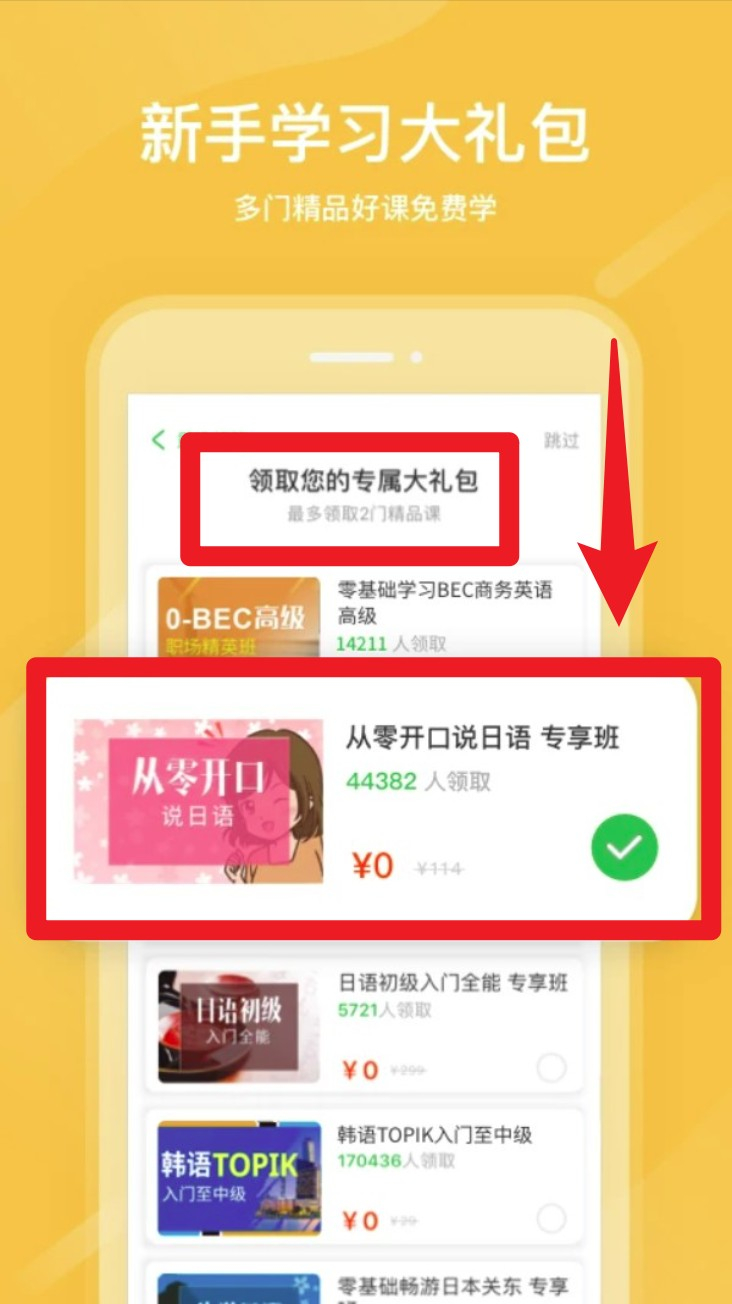 2. 登录后可在弹出页面领取“新手学习大礼包”,选择感兴趣的免费精品课一键加入学习。