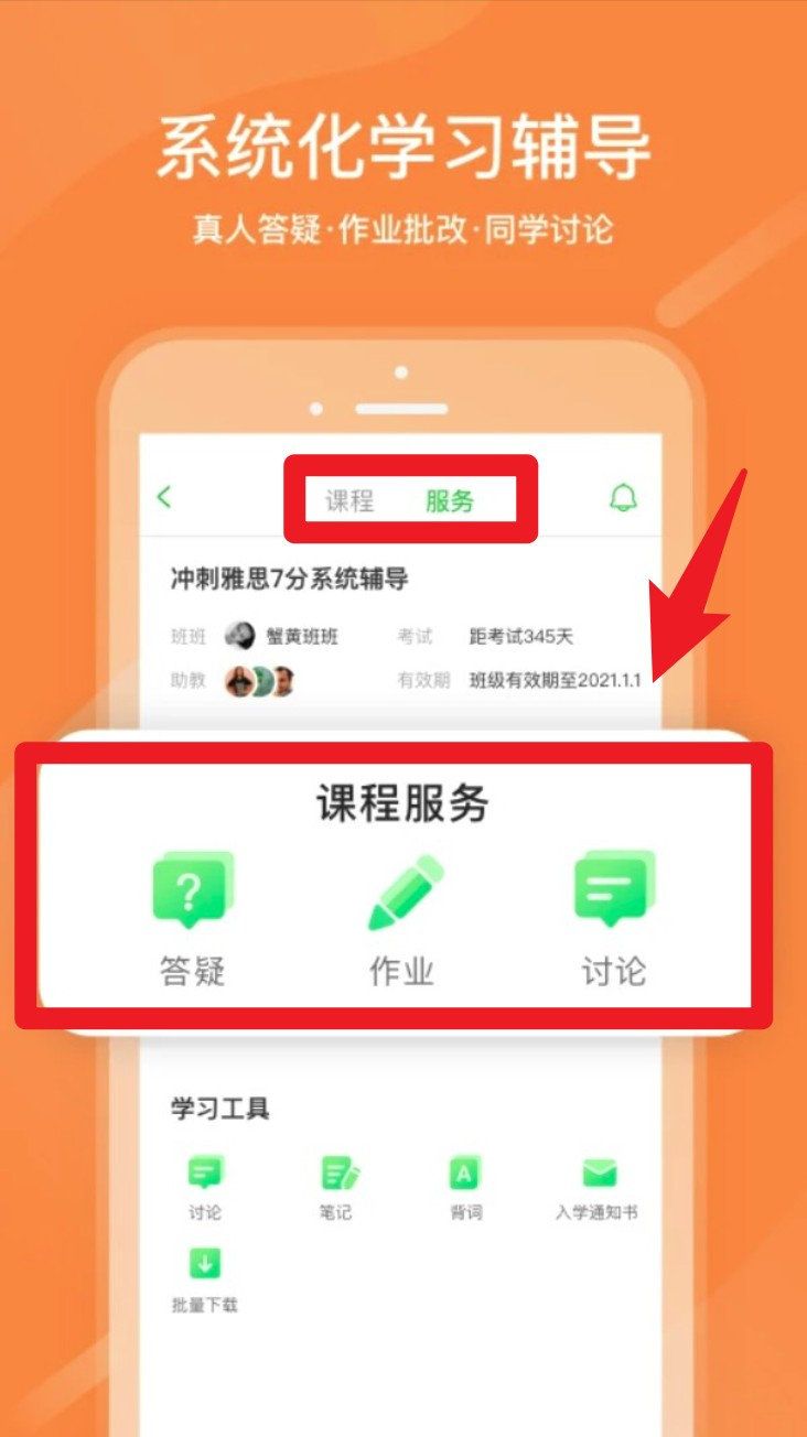 3. 进入课程详情页后,点击上方“服务”页签即可查看答疑、作业、讨论等多项学习支持服务。