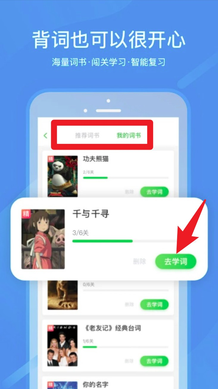 5. 在“我的词书”中可选择词书进入背词模式,每日积累单词并跟踪学习进度。
