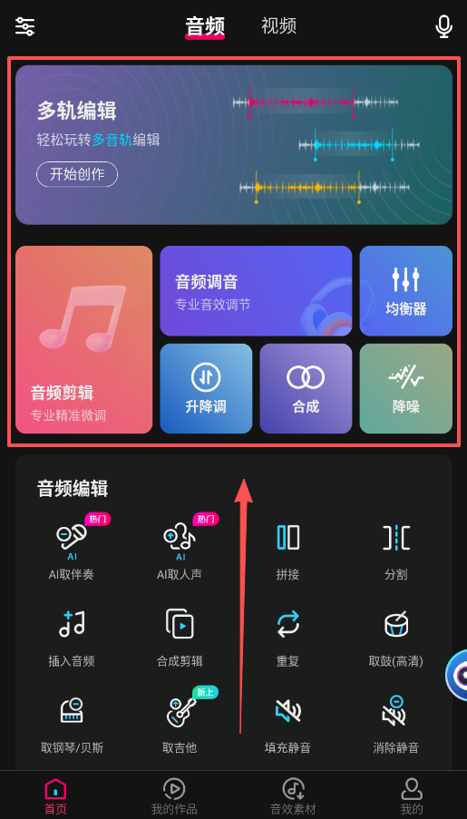3、选好素材后,返回首页点击“多轨编辑”开始创作,你可以把刚才选的音效拖入音轨,和你的主音频进行合成与拼接。