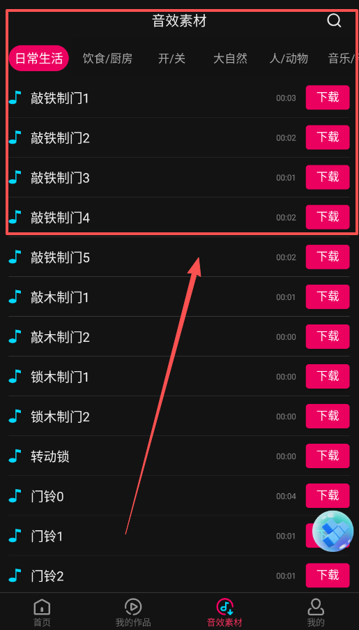 1、要是你想找特定的音效,不妨直接进入“音效素材”板块,这里的素材都按照“饮食/厨房”“开/关”这类场景做好了分类。