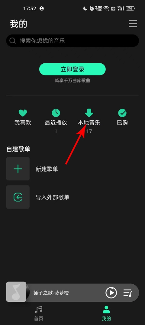 3、我的页面里,登录入口下方设有四个板块,依次为我喜欢、最近播放、本地音乐和已购。当选择“本地音乐”板块时,软件便会自动扫描手机中存储的歌曲。
