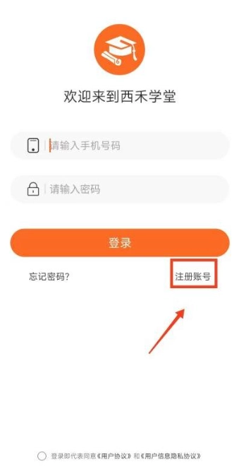 1、打开西禾学堂家长端,点击右下角【注册账号】,输入手机号获取验证码,勾选“用户协议”,点击“下一步”设置登录密码,完成后即注册成功