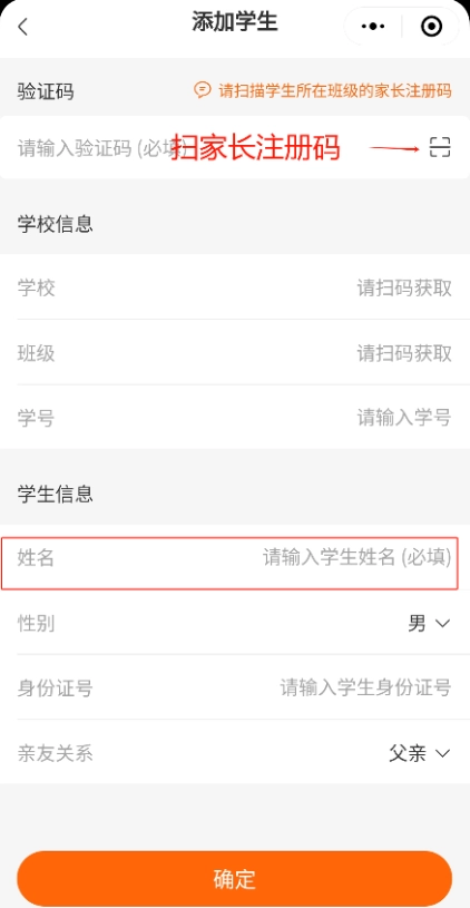 4、扫描学生所在班级的家长注册码(家长注册码找学生班主任或校方获取),页面自动显示出学校、班级信息,输入学生姓名、性别、身份证号、与本人的亲友关系,确认无误后点击“提交”,等待学校或班主任审核通过后即可添加成功学生。