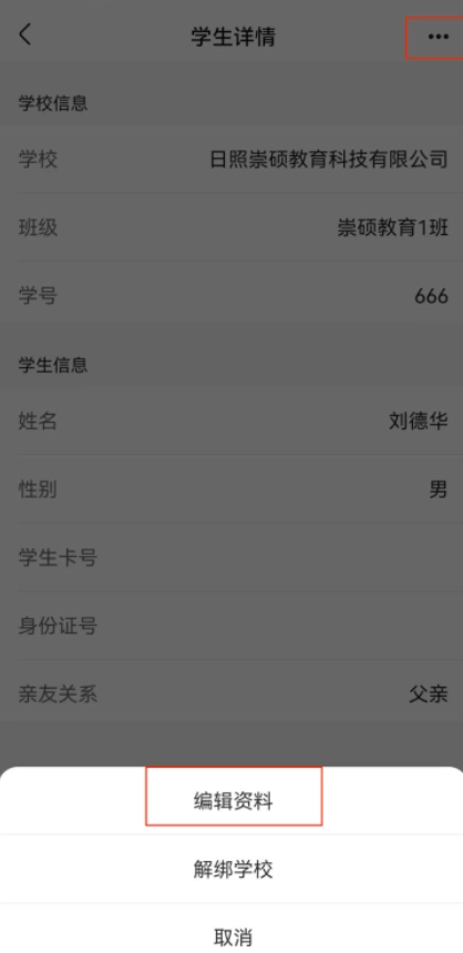 6、点击学生资料可修改学生信息:依次点击【学生资料】进入学生详情,点击右上角三个点【编辑资料】-可修改学生姓名、性别、学生卡号、身份证号、亲友关系、学号。