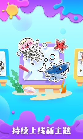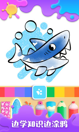 宝宝还能在涂鸦乐园里创作海洋动物主题作品,这里准备了鲨鱼、狮子鱼等16种海洋动物的线稿模板。宝宝可以挑选鲨鱼线稿开启创作,比如先涂黄色作为底色,再添上黑色虎纹,全程能按照自己的喜好自由发挥。完成涂色后,还能同步了解该海洋动物的趣味小百科。整个涂鸦乐园涵盖森林、海洋动物等70多种卡通线稿,为宝宝提供了丰富的涂鸦选择空间。宝宝通过随心涂鸦填色,能在过程中提升艺术审美能力与创造力。