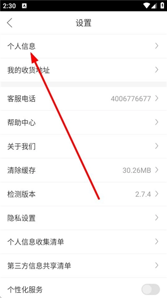 3、进入设置界面后,找到并点击个人信息选项,即可进入个人信息页面。