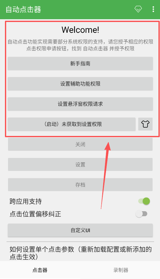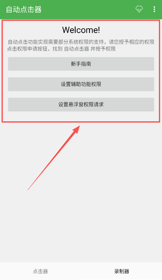 1、首先需要点击权限申请按钮,给自动点击器开启辅助功能与悬浮窗权限,这样后续的自动点击和录制功能才能顺利激活并正常使用。