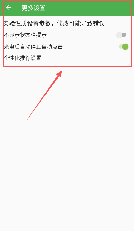 3、进入更多设置页面,你可以开启来电自动停止功能来避免被打扰,也能关闭状态栏提示使界面更简洁,不过要留意那些标注为实验性质的参数。