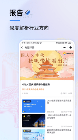 软件整合了海量权威数据资源,能对行业趋势进行深度剖析,业务范围覆盖游戏、软件、电商、金融、教育、互联网等多个领域,以及中国、拉美、东南亚、北美等不同地区。扬帆出海平台还为用户搭建了人脉拓展、企业对接与合作洽谈的桥梁,用户可在平台创建个人档案,呈现自身的专业技能、从业经验与合作需求,进而寻觅契合的商业伙伴与发展机遇,实现人脉网络的有效拓展。