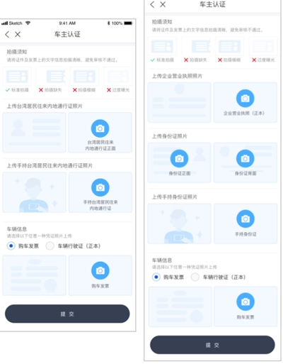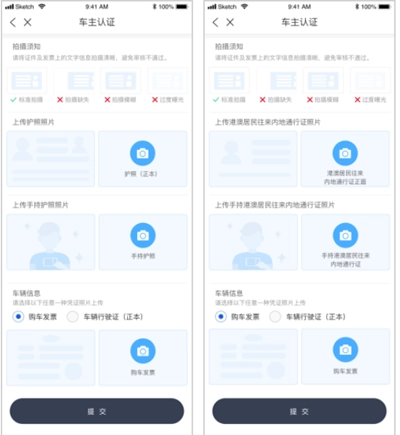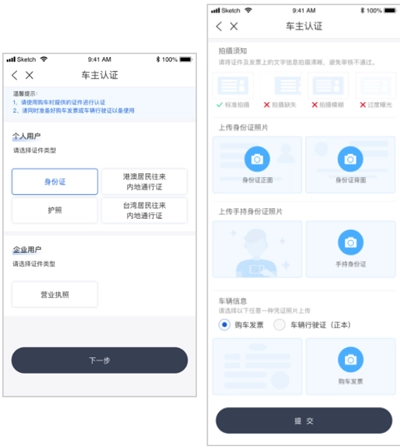填写个人及车辆信息并上传相应照片后,即可完成车主认证。用户首先选择自己车主认证时使用的证件类型,选择后按照页面要求进行信息上传。