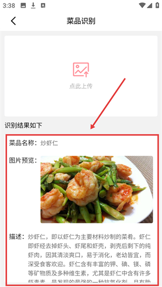 4、上传操作完成后,页面会呈现出识别结果,其中涵盖了菜品名称、图片预览,以及菜品的食材、特点等相关描述信息。