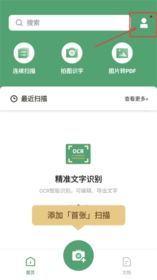1、打开OCR扫描类应用的首页后,点击页面右上角的人物形状图标,即可进入该应用的设置界面。