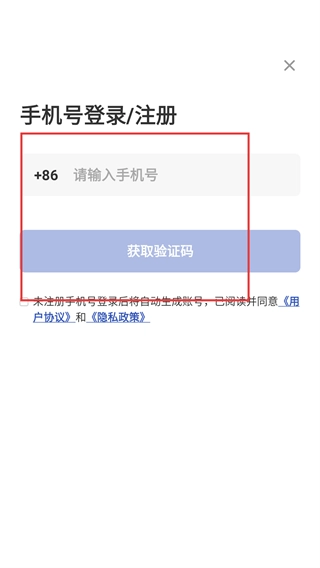 4、进入手机号登录/注册界面,在【请输入手机号】处填写号码,勾选相关协议后点击【获取验证码】,即可完成登录或注册流程。