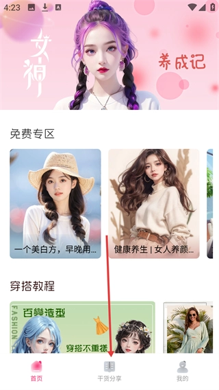 1、在“女神养成记”首页,点击底部【干货分享】选项,可进入美妆护肤类内容的展示页面。