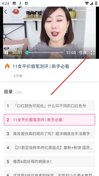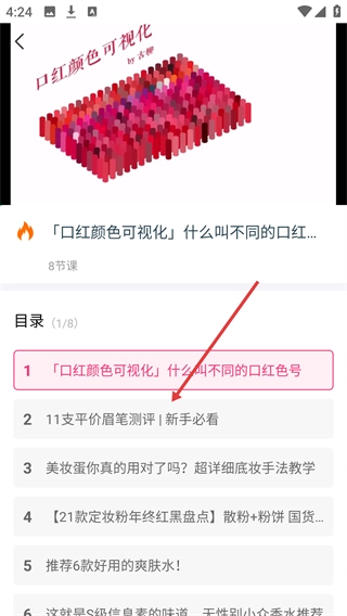 2、在干货分享页面,点击目标内容卡片(如口红相关教程),可进入该内容的课程目录界面。