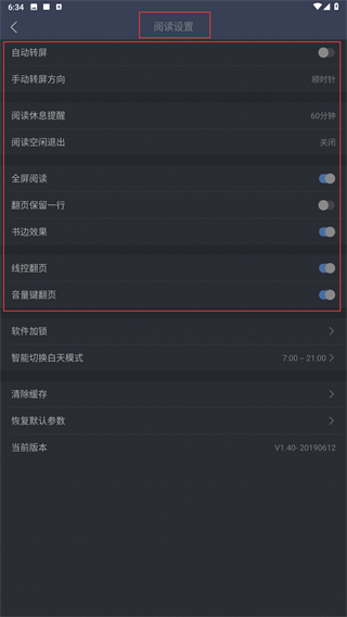 2、进入【阅读设置】页面,能够调整自动转屏、阅读休息提醒等功能,也可以开启全屏阅读、书边效果之类的阅读辅助选项。