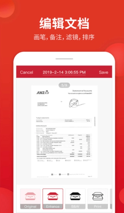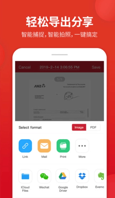 3、只需手机摄像头就能将收据、会议记录或者名片电子化,实现无纸化办公
