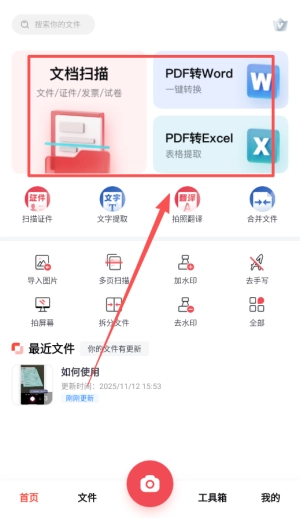 1、打开软件点击拍摄按钮对准文档软件会自动识别边缘完成扫描你可以调整滤镜让文档更清晰。